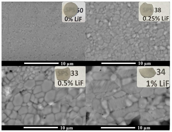 The SPS experiments were conducted based on the protocol proposed by Kato et al. [24]. The effect of the addition of LiF on SPS-produced calcium phosphate is illustrated in Figure 4. The best optical quality was observed when 0.25 and 0.5% of LiF were used.