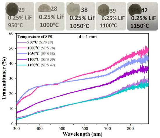 Figure 6 presents the photographs and total transmission spectra of translucent ceramic samples obtained by SPS at different temperatures from COM. HA powder is mixed with 0.25 wt.% of LiF as a sintering additive. The best optical quality was observed for the samples sintered at 1000 °C. Although the quality of the sample obtained at 1050 °C is also good, the worst results were obtained for the ceramics sintered at the lowest (950 °C) and highest (1150 °C) temperatures. Both samples are almost black due to the effect of contamination by carbon originating from the graphite die.