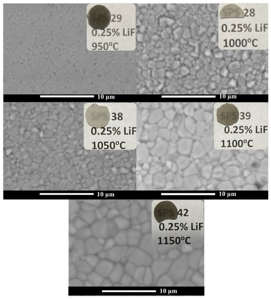 Presented in Figure 9, SEM micrographs of surfaces of sintered bodies obtained from two different starting powders with and without the addition of LiF and sintered at 1000 °C or 1050 °C revealed that the temperature of 1000 °C applied for the sintering is too low or the time (15 min) is too short to obtain good homogeneity and uniform grain sizes. The sintered material consists of larger and smaller grains.