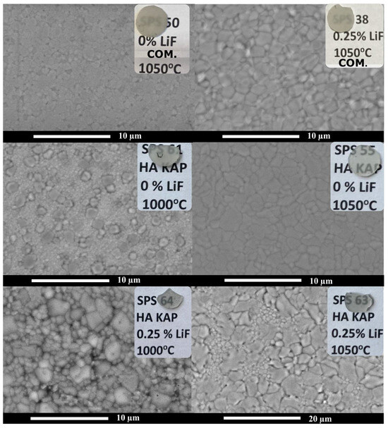 SEM micrographs of surfaces of ceramics obtained by SPS from COM. HA and LAB. HA nanopowders with and without the addition of LiF and sintered at 1000 °C or 1050 °C.