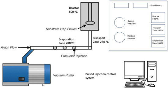 Once the process in the microwave oven was completed, the solid phase was filtered and washed with deionized water. The samples were placed in a desiccator at room temperature to obtain the hydroxyapatite flakes (HAp). The next step was to deposit the TiO2 thin films on the HAp flakes using the metal–organic chemical vapor deposition technique (MOCVD) [12]. For this, 10 mL of acetone mixed with 20 mL of titanium isopropoxide was used as a precursor. The synthesis parameters are shown in Table 1, and the schematic diagram of the synthesis process is shown in Figure 1. After deposition, the flakes were removed from the sample holder and placed in Petri dishes. They were not subjected to any annealing process.