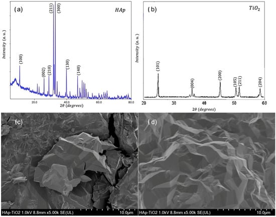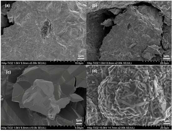 (a) SEM micrograph of HAp flakes at 5000×; (b) SEM micrograph of HAp flakes at 2000×; (c) SEM micrograph of TiO2 at 5000×; (d) SEM micrograph at TiO2 to 2000×.