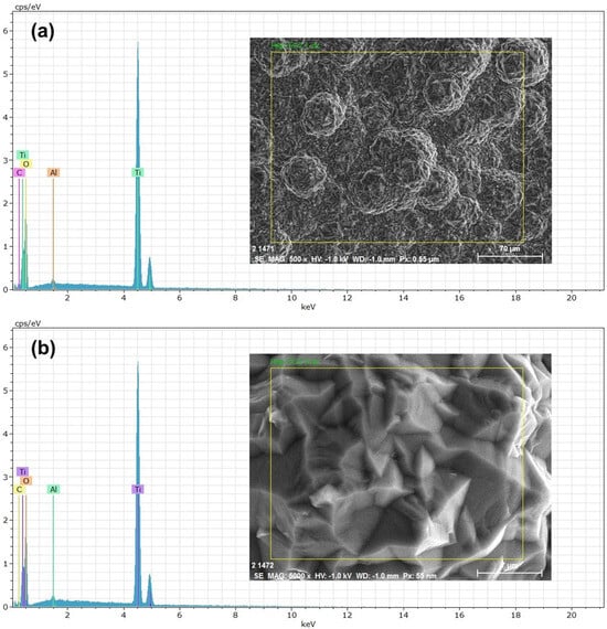 EDS spectra of TiO2 coating: (a) micrograph at ×500; (b) micrograph at ×5000.