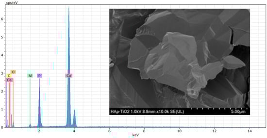 EDS (energy-dispersive spectroscopy) elemental composition analyses were performed on the TiO2 thin films (Figure 4). The results shown at 500× (Figure 4a) and 5000× (Figure 4b) magnifications reveal that the peaks predominantly correspond to Ti (titanium) and O (oxygen) and that the presence of aluminum in the spectra is due to the sample holder used during the analysis. High, sharp peaks indicate that the thin films are of high purity and were successfully deposited on the substrate. The presence of Ca and P is not visible in the spectra because only the TiO2-coated part was analyzed. The atomic percentage of Ti in the sample was 30.89% on average. The EDS results agree with the previous DRX and SEM studies, demonstrating that the elemental composition of the thin films allowed us to determine the chemical composition of the samples. Numerous studies have considered this method for composition analysis [18]. In the EDS study, the accelerating voltage of the electron beam had a significant influence on the obtained results [19]. In Figure 5, the EDS spectrum for the hydroxyapatite flakes is depicted, revealing the presence of calcium and phosphorus with a Ca/P ratio of 1.69. Additionally, both spectra exhibit a trace amount of aluminum, measured at 0.56 wt.%.