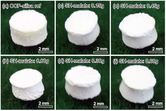 Photographs of the set blocks with different SH-malate amounts. (a) OCP-silica block as reference. (b) SH-malate: 0.00 g. (c) SH-malate: 0.15 g. (d) SH-malate: 0.30 g. (e) SH-malate: 0.45 g. (f) SH-malate: 0.60 g.