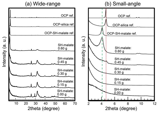 XRD patterns of the set blocks. (a) Wide range. (b) Small angle. Green broken line: OCP-SH-malate d(100)’ peak. Red dotted line: OCP d(100) peak.