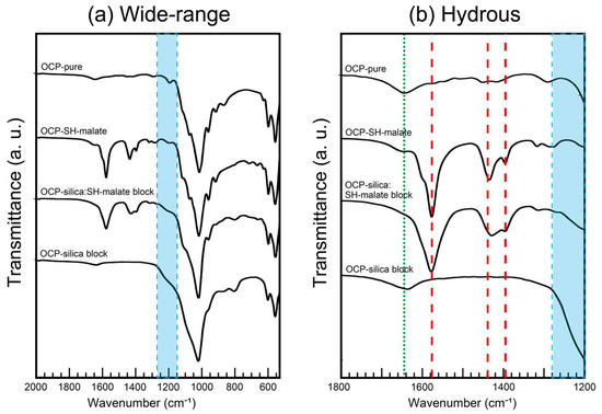 FT-IR spectra of OCP-silica:SH-malate block with OCP–silica and OCP-SH-malate reference for facilitate comparison. (a) Wide range. (b) Hydrous. Blue band: silanol vibration. Red broken lines: -COOH vibration. Green dotted line: HPO4 vibration [39].