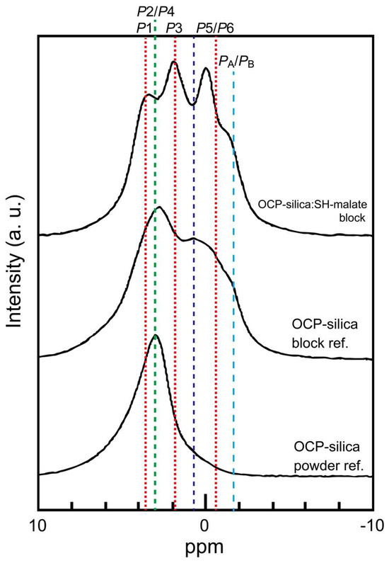 31P solid-state NMR spectra of OCP-silica:SH-malate block with conventional OCP, OCP-silica block, and OCP-silica powder for facilitate comparison. Broken lines corresponded each PO4 state. Dark blue broken line: PO4 of OCP-silica block state [35,40].