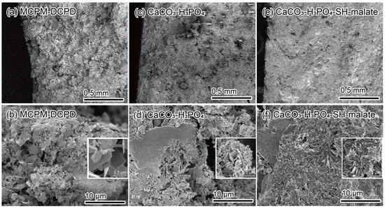 SEM micrographs of OCP-silica:SH-malate block and reference materials in 0.5 mm and 10 μm, respectively. (a,b) OCP-silica fabricated from MCPM-DCPD-Na2SiO3 system. (c,d) OCP-silica fabricated from CaCO3-H3PO4-Na2SiO3. (e,f) OCP-silica:SH-malate block.