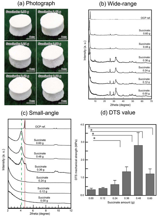 Evaluation results of OCP-silica:succinate block fabrication. (a) Photographs of the set blocks with different succinate amounts. (b) Wide-range XRD patterns of the set blocks with different succinate amounts. (c) Small-angle XRD patterns of the set blocks with different succinate amounts. Green broken line: OCP-SH-malate d(100)’ peak. Red dotted line: OCP d(100) peak. (d) DTS values of the set blocks with different succinate amounts. *: p < 0.05.