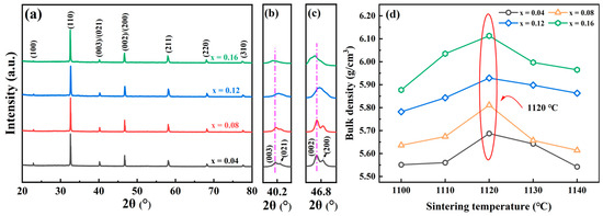 (a) XRD pattern of NBT–xCaHfO3 (x = 0.04, 0.08, 0.12, 0.16) ceramics. The magnified view at 2θ (b) near 40.2° and (c) near 46.8°. (d) The bulk density of NBT–xCaHfO3 ceramics sintered at different temperatures.