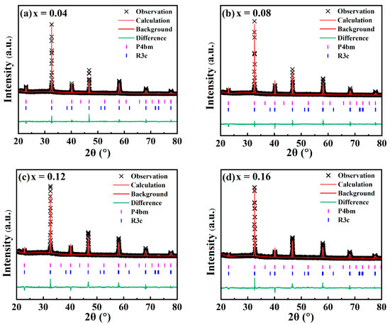 In order to further analyze the effect of CaHfO3 doping on the phase structure and lattice parameters of the NBT–xCaHfO3 ceramics, Figure 2 presents the Rietveld refinement of the full-scan XRD diffraction patterns based on the R3c and P4bm phase, and the corresponding phase proportion, lattice parameters, and reliability factors are shown in Table 1. The reliability factors of weighted patterns (Rwp) and the goodness-of-fit indicator (χ2) of all component ceramics are within the confidence interval, confirming that the results of XRD refinement are relatively reliable. Clearly, the fraction of the P4bm phase first increased and then decreased with the increase in CaHfO3 content, as x = 0.08 reached the maximum. Usually, P4bm as the weakly polar phase could be converted into a polar ferroelectric state under an electric field and return to the original weakly polar state when the electric field was removed, hence the enhancement proportion of the P4bm phase could contribute to the reduction in Pr and thus promote the energy storage properties [31,32]. It can be assumed that the NBT–0.08CaHfO3 ceramics may have optimal energy storage performance accompanied with relatively low Pr.