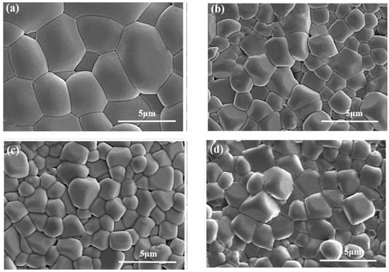 [32,33], and Na+ vacancies (expressed as V′Na) for charge compensation and for maintaining electrical neutrality. Consequently, the oxygen vacancy (), created by loss of oxygen from the crystal lattice at low oxygen partial pressure during sintering at high temperatures had to be inhabited [13,34,35], which further suppressed the conductivity and refined the grain size as well as beneficial to the enhancement of the Eb [36,37]. Furthermore, with the CaHfO3 increasing, more V′Na favor the mass transfer in ceramics during sintering [13,38], and as a consequence, the grain size increased up to 1.40 μm when x = 0.16. The equation for the defect is as follows (Equations (4) and (5)), in which the Kröger–Vink notation was employed.