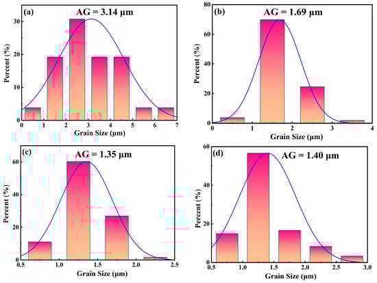 Grain size distribution diagram of NBT–xCaHfO3 ceramics: (a) x = 0.4, (b) x = 0.08, (c) x = 0.12, (d) x = 0.16.
