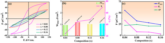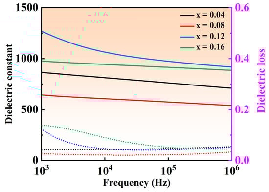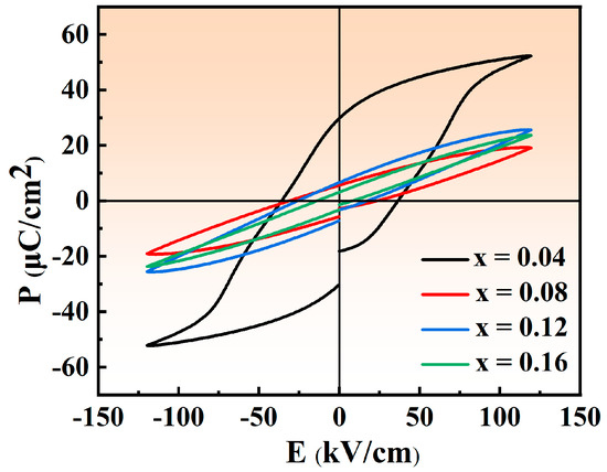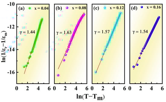 where C represents the Curie–Weiss constant and εm is the dielectric constant corresponding to Tm. The γ obtained by fitting the curves between ln(T−Tm) and ln((1/εr)−(1/εm)) at 1 kHz, as shown in Figure 7, increased from 1.44 (x = 0.04) to 1.63 (x = 0.08) and then decreased to 1.57 (x = 0.12) and 1.54 (x = 0.16), hinting that the optimal relaxation characteristics can be obtained in the composition of x = 0.08. The optimizing relaxation performance may be related to the increased ionic disorder in the microstructure, where the non-equivalent substitution of Ca2+ for Na+ and Bi3+ broke the long-range ferroelectric domains and facilitated the formation of polar nanoregions [49,50,51].