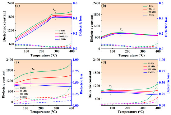 Temperature-dependent dielectric properties of NBT–xCaHfO3 ceramics under various frequencies: (a) x = 0.04, (b) x = 0.08, (c) x = 0.12, and (d) x = 0.16. Solid lines signify dielectric constant and dashed lines denote dielectric loss.