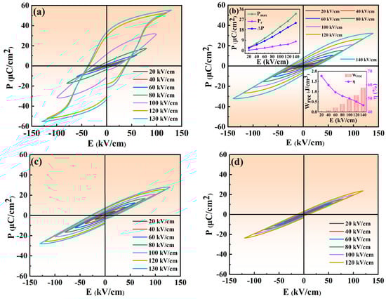 P-E curves of NBT–xCaHfO3 ceramic samples under different electric field: (a) x = 0.04, (b) x = 0.08, (c) x = 0.12, and (d) x = 0.16.