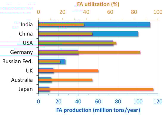 In the global scenario, more than 750 million tons of FA are produced annually worldwide []. The production and utilization of FA in the main world producers are depicted in Figure 1.