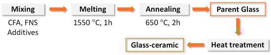 Flow chart of preparation of glass–ceramics from coal fly ash (CFA) and ferronickel slag (NS) (adapted with permission from [], Elsevier 2023).