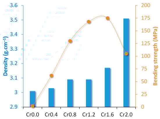 Densities and bending strengths of Cr0-Cr2.0 bulk-nucleated glass–ceramics (adapted with permission from [], Elsevier 2023).