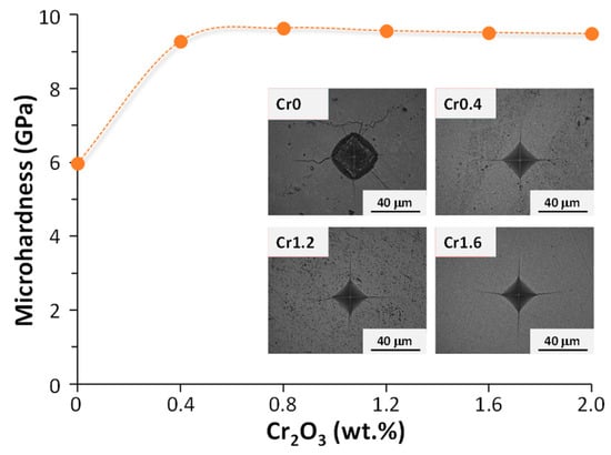 Vickers microhardness of Cr0-Cr2.0 bulk-nucleated glass–ceramics (adapted with permission from [], Elsevier 2023).