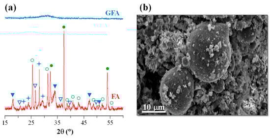 (a) XRD spectra of as-received FA (● calcium oxide (CaO); ○ anhydrite (CaSO4); ▽ quartz SiO2; ▼ portlandite Ca(OH)2; ✦ calcium aluminum silicate) and (b) SEM image of as-received FA (adapted from [], SAGE Publications, 2009).