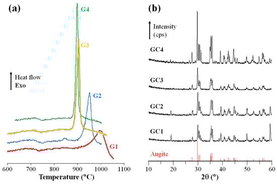 (a) DTA plots of fine powders (glass frit) of the four investigated glasses and (b) X-ray diffractograms the GCs crystallized at 900 °C for 2 h (adapted from [], SAGE Publications, 2009).