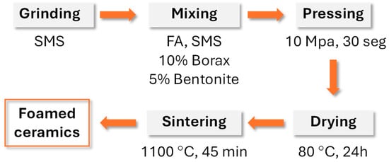 Schematic illustration of the foamed glass–ceramic preparation process (adapted from [], MDPI, 2023).