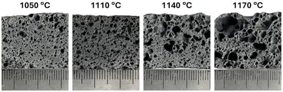 Porous glass–ceramic composites based on waste silicomanganese slag (SMS) and fly ash (FA) as raw materials and silicon carbide (SiC) as a foaming agent were systematically investigated []. Figure 8 presents a schematic illustration of the foamed-glass–ceramic preparation process. The mixture of FA and SMS was thoroughly blended with a specific quantity of water, pressed, dried, and then sintered in a furnace at 1050–1170 °C for 45 min at a heating rate of 5 K·min−1. Figure 9 presents the cross-sectional morphology of the specimens sintered at various temperatures, evidencing the increasing of the size and number of pores with the rising of the temperature []. The best overall performance was achieved for compositions comprising 20 wt.% SMS and 80 wt.% FA as raw materials, with a SiC addition of 1.0 wt.% and a sintering temperature of 1100 °C (Figure 9), compressive strength, bulk density, and total porosity of 8.09 MPa, 0.57 g·cm−3, and 71.04%, respectively. These properties make it suitable for application as an insulating material or as a decorative material for building partitions [].