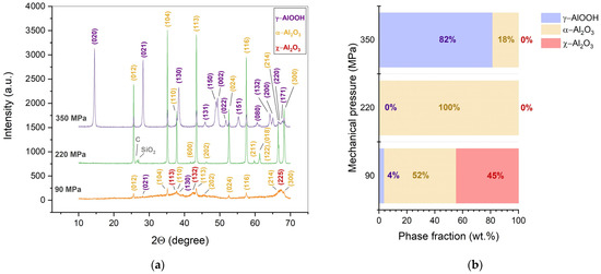 Figure 2. XRD patterns (a) and phase fractions (b) of the ceramic samples manufactured by CSP at 450 °C and the indicated mechanical pressure (90–350 MPa). Miller indices correspond to the following phases: γ-AlOOH (PDF2 #000-83-2384), α-Al2O3 (PDF2 #000-71-1683), and χ-Al2O3 (PDF2 #000-04-0880). Phase fractions are presented excluding foreign impurities.