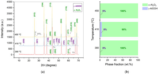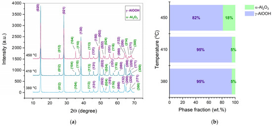 Figure 4. XRD patterns (a) and phase fractions (b) of the ceramic samples manufactured by CSP at a pressure of 350 MPa and the indicated temperature (380–450 °C). Miller indices correspond to the following phases: γ-AlOOH (PDF2 #000-83-2384) and α-Al2O3 (PDF2 #000-71-1683).