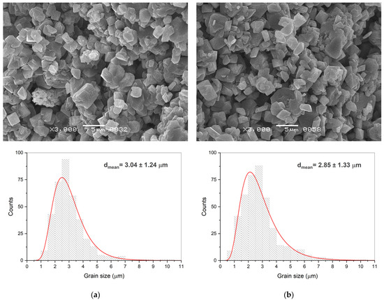 Figure 5. Fractured surfaces SEM images of the ceramics manufactured by CSP at a mechanical pressure of 220 MPa and a temperature of 380 °C (a) and 450 °C (b). Corresponding grain size distributions were calculated on the basis of 400 measurements of the grain size in each of the samples.