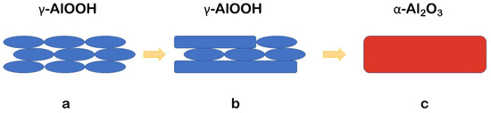 Figure 7. A schematic representation of the microstructural transformations during the CSP: (a) formation of fine-grained boehmite structure; (b) formation of plate-like boehmite grains by coalescence; (c) α-Al2O3 formation.