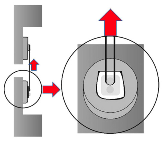 Diagram of the shear bond strength test. Red arrows indicate the direction of the force.