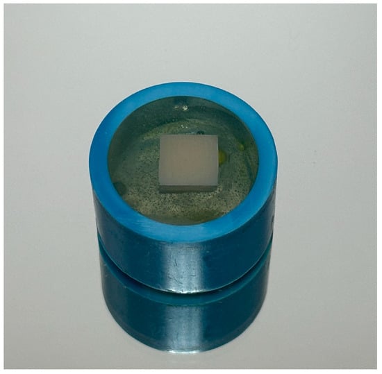 The G*Power 3.1 system was implemented to estimate the sample size, considering a significance level of 0.05 and a power of 0.95. Sixty fully sintered zirconia specimens were created using a sixty-zirconia block (Argen™ Z HT+ Multilayer Zirconia Disc, San Diego, CA, USA). Each specimen had a 6 × 6 mm in dimension and 4 mm thickness. The sintering procedure was carried out on the zirconia specimens in compliance with the manufacturer’s directions. The samples were put inside polyvinyl chloride tubes and then filled with epoxy resin (Figure 1).