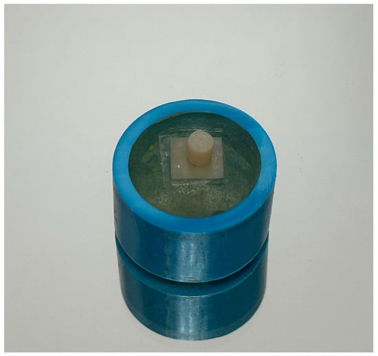 Afterwards, a self-adhesive resin cement was loaded into the bonding location, which was controlled by a polyethylene adhesive tape hole. The resin composite rod was fixed on the self-adhesive resin cement using a modified durometer, applying a force of 50 N []. Any remaining cement was then removed (Figure 2). The specimens were maintained in a dark container for a duration of 30 min. Subsequently, the specimens were put in distilled water and kept in an incubator (Vevor lab, Rch Cucamonga, CA, USA) at a temperature of 37 degrees Celsius for a duration of 24 h.