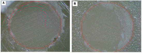 Provides a visual representation of the fracture pattern for DCA + RXS: (A) adhesive pattern; (B) mixed pattern.