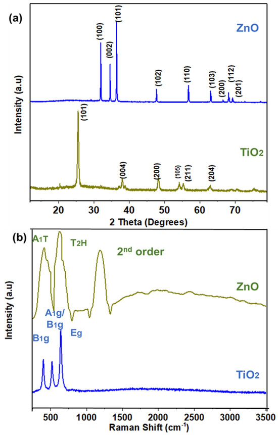 (a) XRD spectra for TiO2 and ZnO nanofibers; (b) Raman spectra for TiO2 and ZnO nanofibers.