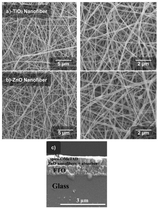 Since semiconductor nanomaterials have special features in nanoscale devices, there has been significant interest in researching them. In particular, research has evolved to focus on their use in solar energy-harvesting for photocatalysis, electricity, and environmental remediation [1,2]. TiO2 and ZnO nanostructures, being significant semiconductors, have been thoroughly investigated in the field of photovoltaics, particularly in relation to perovskite solar cells (PSCs) [3]. They are preferred as electron transport materials (ETM) due to their large specific surface area and 1D shape. TiO2 and ZnO offer a direct path for electron movement. While some researchers claim that ZnO in a wurtzite or hexagonal structure gives remarkable performance, others suggest that the crystalline characteristics of TiO2 nanostructures are more compatible with ETM [4]. Both ZnO and TiO2 nanofibers typically have a surface area of 30–40 m2 g−1 and a broad distribution range of 80–300 nm. Due to their main features of higher electron mobility, mesoporous TiO2- and ZnO-based ETMs for PSCs exhibit remarkable photovoltaic performance [5]. Higher electron or carrier mobility ideally supports higher current densities and improved open-circuit voltage. Furthermore, a lower recombination rate is required to prevent PSCs from internal losses.