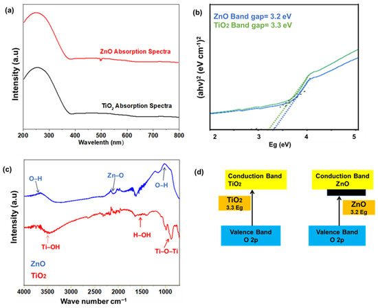 (a,b) UV vis absorption characterizations for photoanodes, (c) FTIR spectra for photoanodes, (d) bandgap mechanism for photoanodes based on TiO2 (red) and ZnO (black).