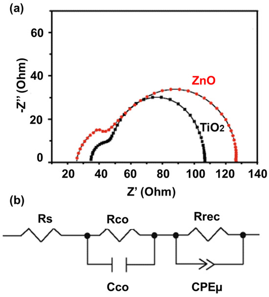 (a) Electrochemical Impedance spectra for TiO2 and ZnO; (b) circuit diagram for EIS.