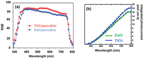 The integral of the current density from External Quantum Efficiency (EQE) curves is a key parameter for evaluating the performance of photovoltaic devices, such as the solar cells shown in Figure 7b. The EQE curve represents the fraction of incident photons that are converted into electrical current at each wavelength of light. In our devices, the integrated photocurrent density for the ZnO photoanode is 16 mA cm−2, while for TiO2, its value is 18 mA cm−2. The integrated current density derived from the EQE spectra in Figure 7b is close to the Jsc measured under simulated sunlight.