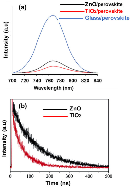 A PL spectrophotometer was used for the characterization of charge recombination dynamics in perovskite solar cells. The electron and hole recombination of TiO2 and ZnO were compared using photoluminescence (PL) spectra, as shown in Figure 8a. The high peak intensity of ZnO shows a higher direct recombination of electron-hole pairs. In contrast, TiO2 nanofibers decrease the recombination of charges, thus resulting in better charge separation and associated photo-conversion efficiency. Charges have longer dwell times, hence charges can participate in photo-conversion efficiency for longer times.