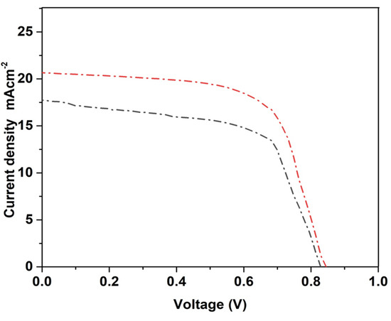 J-V measurements were performed to determine solar cell characteristics and to assess how TiO2 and ZnO nanofibers affected the performance of solar cells. Figure 9 illustrates the JV performance of photoanodes built on titanium and zinc oxide nanofibers. Table 3 also provides a summary of all performance metrics. The current density (Jsc) of ZnO nanofibers was 17.77 mA/cm2, while TiO2 had a Jsc of 20.68 mA/cm2. This increase is the result of TiO2’s improved conductivity of the ETL, which makes it possible for perovskite solar cells to efficiently use photons for energy harvesting [33]. As a result of TiO2’s superior charge transport characteristics over ZnO, more electrons are drawn to the external circuit, leading to a larger Jsc. In addition to effectively accelerating electron transport and lowering recombination rates to increase Jsc, band alignment with TiO2 also produces effective ETLs. TiO2’s transparency contributes to increased Jsc values and improved light absorption by the perovskite layer. Jsc is much better with TiO2 nanofibers ETL, which may be due to better band alignment. The electrons easily move from the perovskite conduction band to the TiO2 conduction band due to appropriate band alignment.