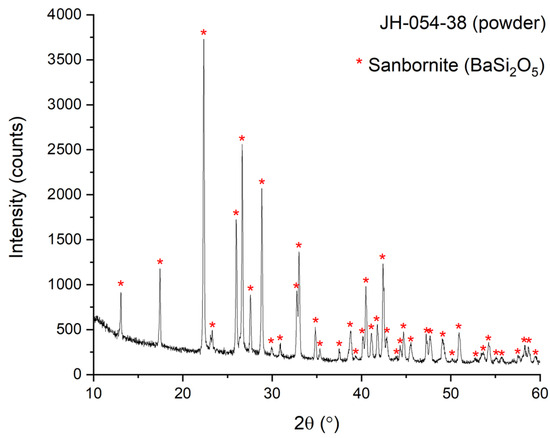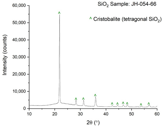 The Pyrex-type glass was subjected to the same heat treatment used for code JH-054-38. The XRD of the heat-treated Pyrex-type powder (1 h at 900 °C; code JH-054-66) is given in Figure 3. Figure 3 shows that the powder of the Pyrex-type glass crystallizes after a 1 h heat treatment at 900 °C. All the lines in the crystalline phase can be assigned to α-cristobalite. Figure 1 and the rest of the XRD figures (Figure 4, Figure 5 and Figure 6) do not show the presence of cristobalite, even though the Pyrex by itself crystallizes when heated at 900 °C.