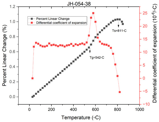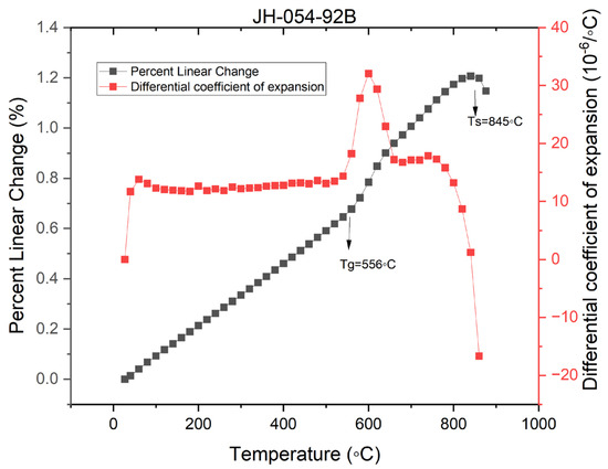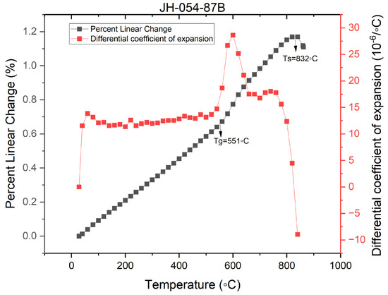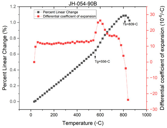 Figure 7, Figure 8 and Figure 9 present the dilatograms of the third run of JH-054-90B (850 °C), JH-054-87B (900 °C), and JH-054-92B (950 °C), respectively. The dilatograms of JH-054-87B (900 °C), JH-054-90B (850 °C), and JH-054-92B (950 °C) are similar to the dilatogram of sample code JH-054-38. In all the dilatograms, the apparent dilatometer softening point is very high and well above 800 °C. The apparent dilatometer softening point increases with the sintering temperature: 809 °C (at 850 °C sintering), 832 °C (at 900 °C sintering), and 845 °C (at 950 °C sintering). The high apparent dilatometer softening point indicates the high viscosity of the composite and no distortion of the bars occurred, as was shown experimentally. All the bars retained their original shape after sintering (1 h) in the 850–950 °C range.