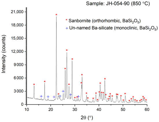 The high-expansion crystalline-phase BaSi2O5 (sanbornite) is formed during a very short (1 h) heat treatment in the 850–950 °C range as a reaction product between BaCO3 and Pyrex-type glass powder. Barium silicates are usually synthesized [13] at very high temperatures (1500–1550 °C) and require intermittent grinding. The data in Table 1 show that the window for processing is wide—at least 50 °C (samples JH-054-87B and JH-054-92B).
