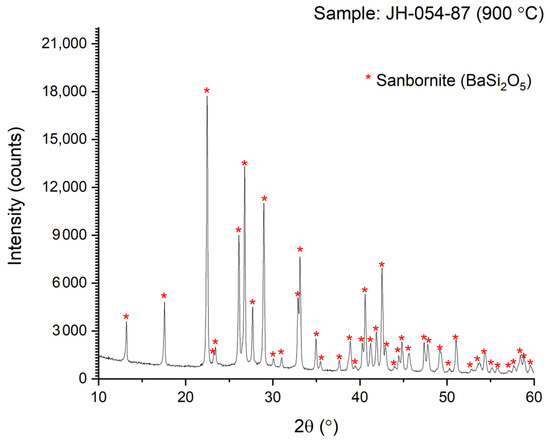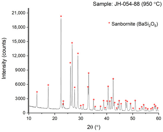 Figure 4 (the XRD of the sintered bar at 850 °C prepared by the modified procedure (with extra grinding)) shows the lines of sanbornite (PDF card # 01-071-1441; Pcmn (space group number 62)) as a major phase and faint lines of another phase of unnamed barium silicate (PDF card # 04-009-1825; Monoclinic BaSi2O5—C2/c (space group number 15)) as a minority phase. At 850 °C, the XRD shows lines of two phases of barium silicates, and at higher temperatures (Figure 5 and Figure 6), only the sanbornite is stable (PDF card # 01-071-1441).