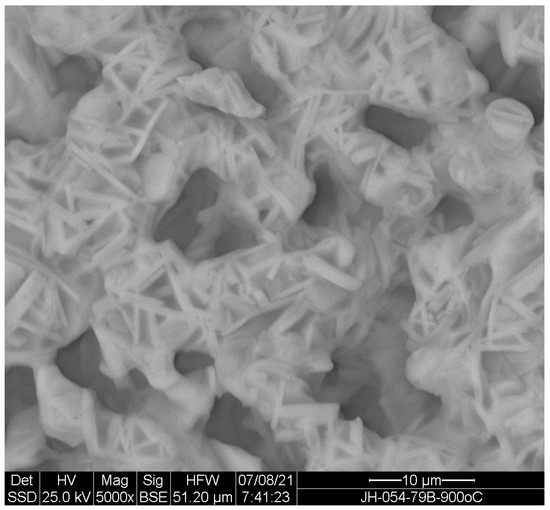 Three bars (codes JH-054-079A-C) were also prepared with the same materials and weights of sample code JH-054-38. The bars were sintered for 1 h at 850 °C, 900 °C, and 950 °C, respectively, and were used for SEM. The SEM pictures of sample codes JH-054-079A-C are given in Figure 10, Figure 11 and Figure 12. Figure 10 shows the SEM of JH-054-079A (a sintered bar at 850 °C for 1 h), with many pores ranging in size from two to nine microns and a crystalline phase that is clearly shown by the white rods. Because of the large number of pores, the sintered sample might be porous with connected pores. Figure 11 presents the SEM of JH-054-079B (a sintered bar at 900 °C for 1 h). It shows fewer pores than JH-054-079A (a bar at 850 °C for 1 h), has pore sizes in the range of two to nine microns, and is more crystallized, shown by the white rods with some plate-like crystals. This sample might be porous, like a bar sintered at 850 °C for 1 h. Figure 12 presents the SEM of JH-054-079C (a sintered bar at 950 °C for 1 h). It shows a highly crystallized sample with a very small number of minute pores (with a size of about 1 micron), and the crystalline phase is shown by the white plates. JH-054-079C is probably a low-porosity sample. Figure 10, Figure 11 and Figure 12 show that the microstructure can be controlled by thermal processing.