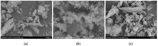 In the scope of our investigation, supplementary experiments were conducted to further characterize our raw material powders. Particular emphasis was placed on examining the morphology of both our metakaolins and fillers, as depicted in Figure 1 and Figure 2, respectively, utilizing Hitachi SU5000 (Hitachi High-Tech, Tokyo, Japan) and images acquired through Scanning Electron Microscopy (SEM). These SEM images offered invaluable visual insights, facilitating a detailed examination of the material morphology and enhancing our comprehension of microscopic properties. Following this, we proceeded to analyze the chemical composition of these constituents, as outlined in Table 1, employing Energy-Dispersive Spectroscopy (Thermo Scientific™ UltraDry EDS Detector, Waltham, MA, USA) to identify and quantify the elements present in the samples.